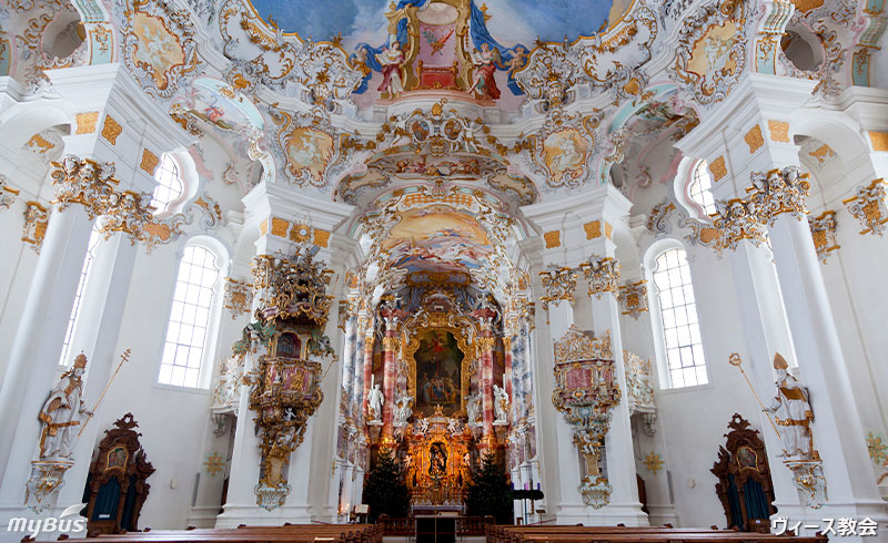 | 09:00~09:30 | 📍【世界遺産】 ヴィース教会入場見学(滞在約1時間)広大の土地の中にひっそりと佇むヴィース教会ですが、扉を開けると、『うぁ』と声が漏れてしまうような、内観が目に飛び込んできます。長閑な外とは対照的な、豪華絢爛な美しさをお楽しみください。 |