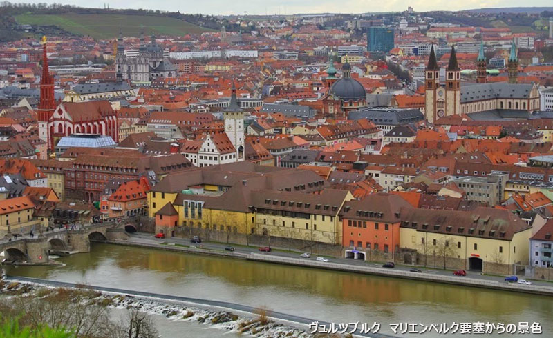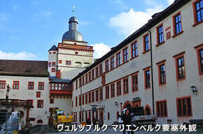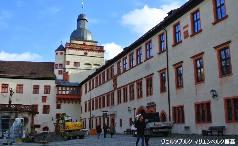 丘の上にそびえるマリエンベルク要塞(外観)、レジデンツ宮殿周辺などを徒歩観光。