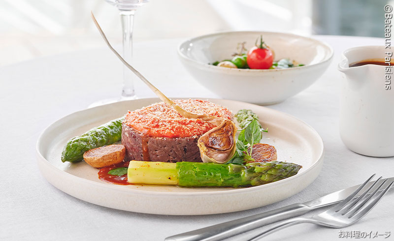 | 20:00頃 | 船発着所到着 ⛴乗船開始 ✨セーヌ川を遊覧しながら船上にてディナー✨ 🌟エトワール 食事の例🌟 🍴前菜・メイン・デザートのチョイスメニュー 🍷食前酒(キール1杯)、白ワイン・ロゼワイン・赤ワインのいずれか、ミネラルウォーター、コーヒー 🌟プルミエ 食事の例🌟 🍴アミューズブーシュ、前菜、メイン、チーズ、デザートのチョイスメニュー 🥂食前酒(シャンパン1杯)、白ワイン+赤ワイン、または白ワイン+ロゼワイン、デザート時に再度シャンパン1杯、ミネラルウォーター、コーヒー ※食事内容は季節によって変わります。 ※アルコールをお召し上がりいただけないお客様は、ソフトドリンクをご提供いたします。 |