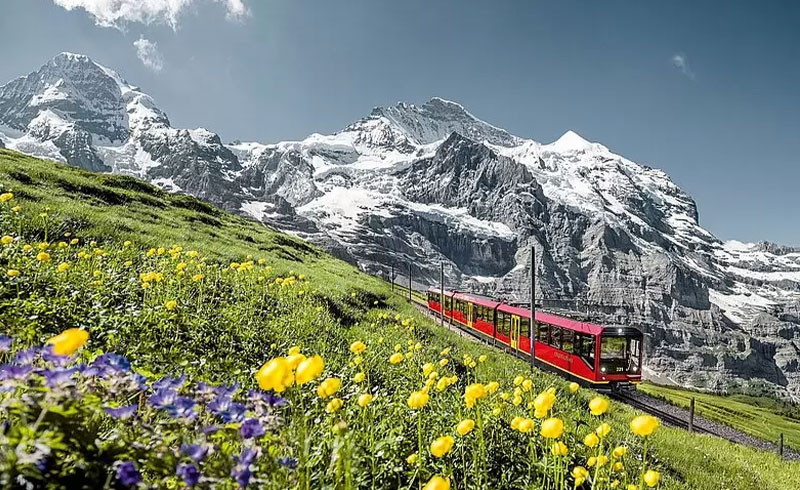 インターラーケン、グリンデルワルト、ラウターブルンネン谷など、アルプスの名所も車窓または短時間散策で楽しめます。