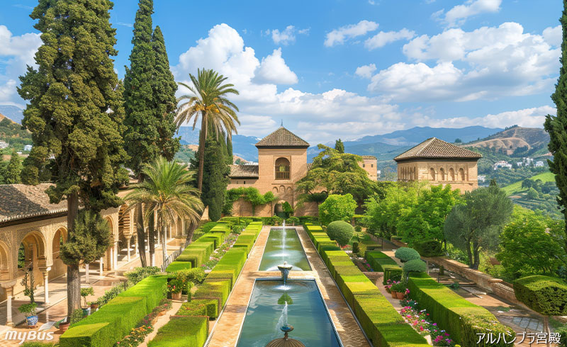 世界遺産アルハンブラ宮殿とヘネラリーフェ庭園の観光を通じて、イスラム文化の影響を色濃く受けた建築美と庭園の静謐さを体感。