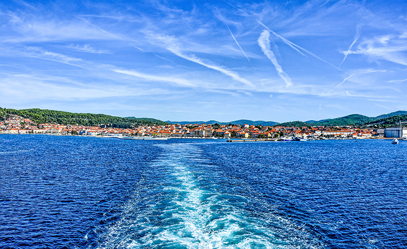 コルチュラ島へはボートで対岸の街から渡ります。ボートから見るオレンジの瓦屋根のコルチュラの町並みと、コバルトブルーに煌く美しいアドリア海は絶景です。