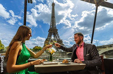 パリ旅行の人気体験、セーヌ川ランチ&ディナークルーズ。ガラス張りの遊覧船で名所を眺めながら本格フレンチを満喫。選べる3つの座席プランで特別なひとときを。※チケット手配のみ。