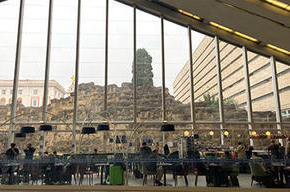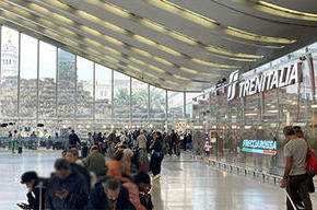| バスターミナルのチンクエチェント広場を背にしてテルミニ駅構内左手にある、ガラス張りのTRENITALIAのチケット売り場TRENITALIAのロゴの下にご集合ください。 ※集合場所であるTRENITALIA ロゴ下のチケット売り場前から駅の外に目を移すと、駅建物ガラス越しに遺跡が見えるのがポイントです。 |