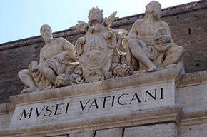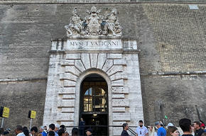| バチカン市国の外壁に沿ってバティカーノ大通りを歩いていくと、大きな彫刻とMVSEI VATICANIの文字がかかげられたアーチ型の白い門が見えてきます。