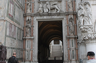 【ベネチア】ドゥカーレ宮殿出口を正面に見て左手前の角にある「テトラルキア像」(チョコレート色の4体の石像)前