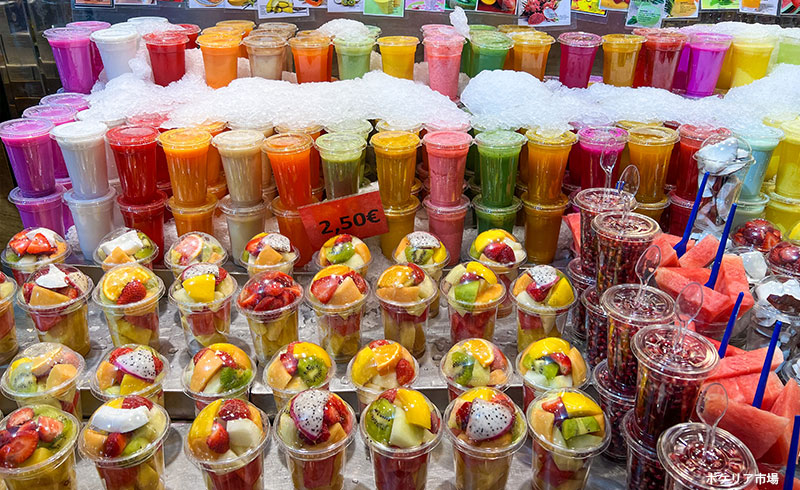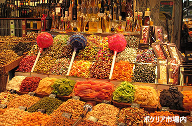 | 11:00頃/16:00頃 | 活気あるれるボケリア市場を散策 地中海ならではの食材も豊富に売られているバルセロナの台所こと「ボケリア市場」。色とりどりの食材をみるだけでも楽しくなってしまう市場を散策します。ガイドさんとともにショッピングもでき、スペインならではの食材をその場でたべることもできちゃう! |