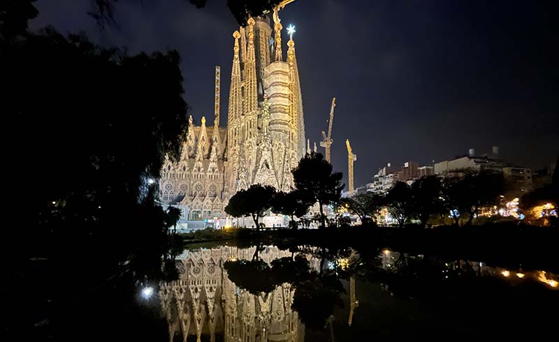 夜のサグラダ・ファミリアのイルミネーションは滞在中是非見学したい!お昼とは違った魅力に見とれてしまいます。