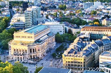 ゲーテハウス・・・Innenstadt地区にある作家ゲーテの生家。明るいクリーム色の外観が目印です。ゲーテ博物館と隣接しており、ゲーテゆかりの品々のほか、ゲーテの親交があった画家の作品なども見ることができます。 レーマー広場・・・木組みの家に取り囲まれたレーマー広場は、フランクフルトの中心にありいつも観光客で賑わいます。 ドーム・・・フランクフルト最大の宗教建築であるドームは、レーマー広場からも近い大聖堂。内部は美しいアーチ型の天井が特徴。 マイン川(アイゼナー小橋、歩行者専用)・・・ライン川の支流であるマイン川。マイン川が流れる最大の都市がフランクフルトです。 マインタワー・・・フランクフルトを一望できる高層ビル「マインタワー」はオフィス街の中にあります。近代的なビルと旧市街のコントラストもフランクフルトの特徴です。 カタリーネン教会・・・ハウプトバッへにある淡い色調が美しい教会。周囲はショップやレストランなどが立ち並びます。 ハウプトバッへ・・・フランクフルトで最も有名な広場の一つハウプトバッへは、デパートなどがありショッピングや食事におすすめのエリア。同名のカフェはエリアを代表する建物で、訪れる価値あり。 証券取引所・・・フランクフルトと言えば金融の中心地。証券取引所は威厳のある建物に風格を感じます。正面にある牛と熊の彫像は、金融用語にちなんでいます。 旧オペラ座・・・かつてのオペラハウス、現在のコンサートホール。夜にはライトアップされ、その存在感は必見です。 ゲーテ通り・・・高級ブランドのショップがずらりと並ぶゲーテ通りは、ショッピングがお好きな方におすすめ! |