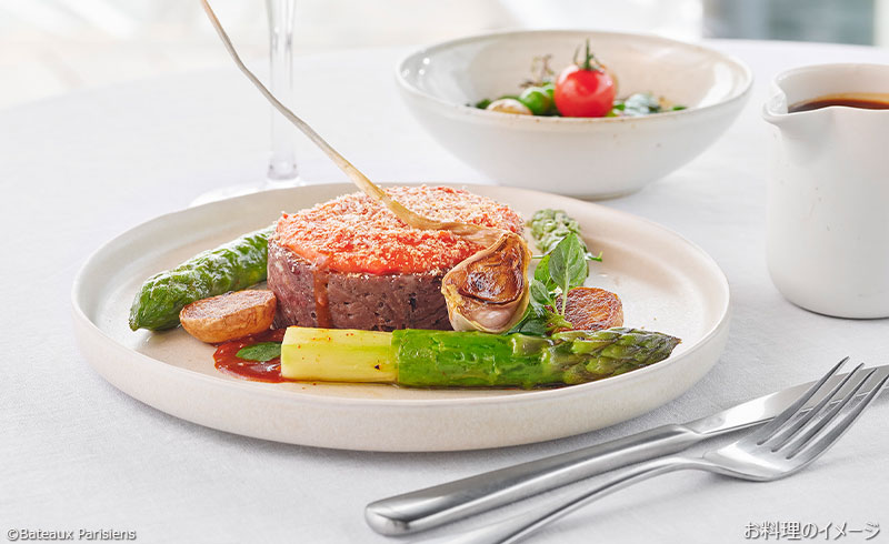 | 20:00 | 📍船発着所到着 遊覧船に乗船開始 ✨~セーヌ川を遊覧しながら船上にて夕食~✨お食事の一例 ・南西地方の鴨のフォアグラ、アプリコットチャツネ、パリ風ブリオッシュ ・牛フィレ肉、ベビーポテト、タラゴンソース ・ラズベリーのチーズケーキ・食前酒 ・ワイン ・ミネラルウォーター ・コーヒー ( 2025年10月現在) ※アルコールをお召し上がりいただけないお客様は、ソフトドリンクをご提供いたします。 |