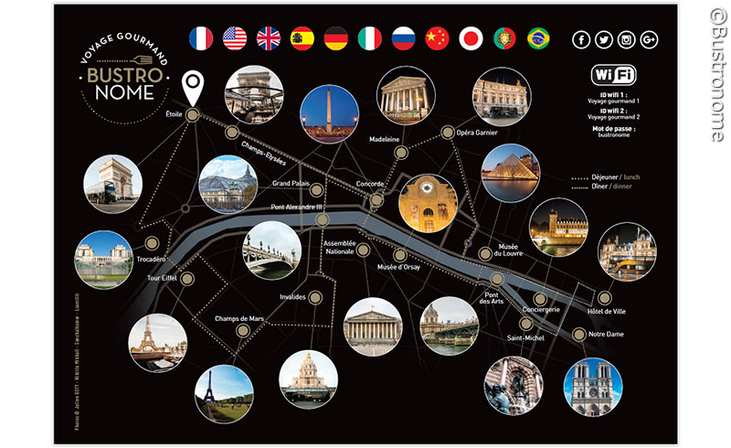 凱旋門から始まり、エッフェル塔やコンコルド広場などパリの美しい名所の数々を巡りながら頂くお食事は一生の思い出になること間違いありません。車内では日本語のオーディオガイドもご利用頂けます。📜コースメニュー(一例です)