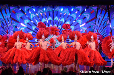 ムーランルージュは、1889年にパリが最も繁栄したベルエポックの時代に生まれました。画家ロートレックが足繁く通い踊り子たちを描いたことでも有名ですが、現在でも当時のノスタルジックな雰囲気の中で、歌、フレンチカンカンと呼ばれる19世紀中頃からフランスで流行した速いテンポのダンス、大道芸とを組み合わせた圧巻のショーが、毎夜繰り広げられています。演目「フェーエリー」(Feerie)のフィナーレは、旋律に合わせてスカートをまくり、足をはね上げて踊る、刺激的なフレンチカンカン。