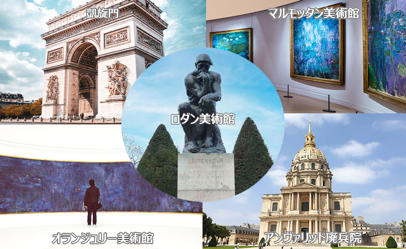 | 表示料金に含まれるもの | 【プラン共通】 日本語公認ガイド、ご希望の美術館一箇所入場(ロダン美術館、オランジェリー美術館、マルモッタン美術館、アンヴァリッド廃兵院)、または凱旋門 【専用車付きプラン】 上記に加え、専用車 |
