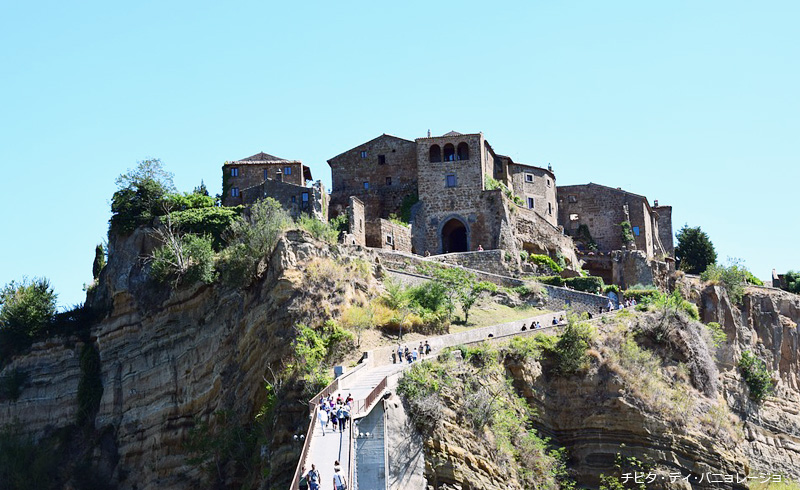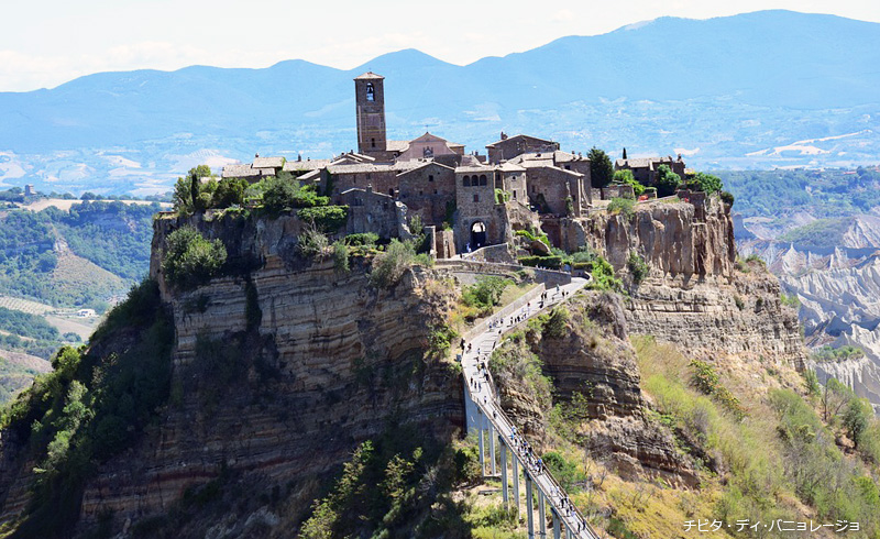 カランキと呼ばれる浸食された谷間の断崖絶壁に静かにたたずむ天空の村「チヴィタ・ディ・バニョレージョ」。村の上からは思わぬ息を呑む感動の絶景が広がっています。世界一美しい丘上都市・オルヴィエートで自由散策!